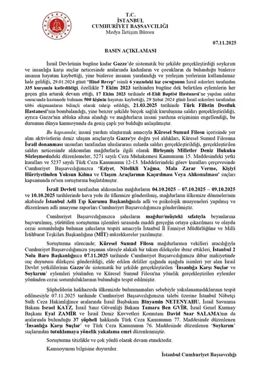 İstanbul Cumhuriyet Başsavcılığı, Gazze’de sivillere yönelik saldırılar ve Küresel Sumud Filosu’na yapılan müdahale nedeniyle aralarında İsrail Başbakanı Binyamin Netanyahu’nun da bulunduğu 37 üst düzey yetkili hakkında “soykırım” ve “insanlığa karşı suçlar” suçlamasıyla yakalama kararı çıkardı. Yakalama kararı çıkarılan isimler arasında Savunma Bakanı Katz, Sınır Güvenliği Bakanı Ben Gvir, Genel Kurmay Başkanı Eyal Zamir ve Deniz Kuvvetleri Komutanı Salama da bulunuyor.