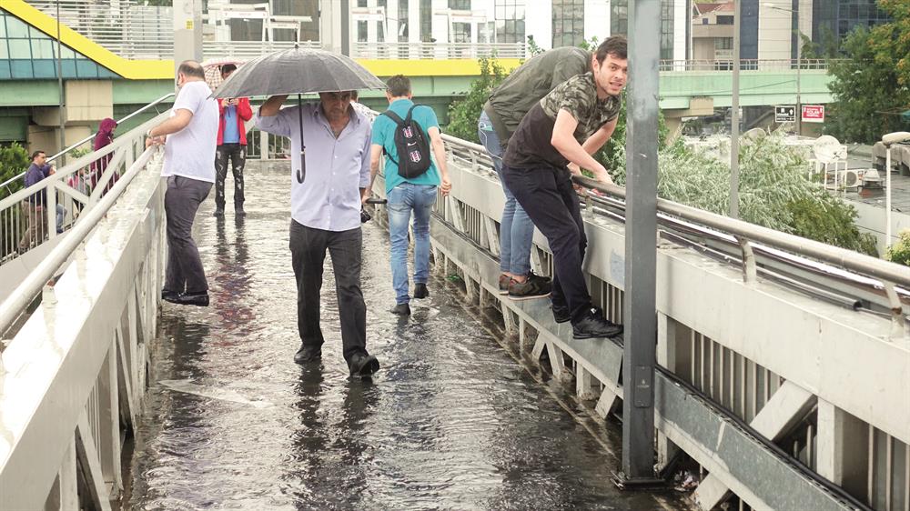 Yağış nedeniyle Merter yan yol bir süre trafiğe kapandı. Merter’deki metrobüs üst geçidini su bastı. Bu nedenle bazı vatandaşlar, üst geçidin demir korkuluklarına çıkarak yürümek zorunda kaldı.