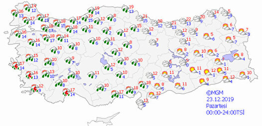 - İzmir:Çok bulutlu, aralıklı sağanak ve gök gürültülü sağanak yağışlı (Yağışların; kuvvetli olması bekleniyor.) 17