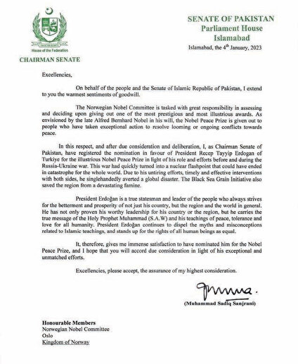 Pakistan Senatosu, Cumhurbaşkanı Erdoğan’ı Rusya ve Ukrayna arasındaki arabuluculuk çalışmaları ve Tahıl Koridoru Anlaşması konusundaki çabaları nedeniyle Nobel Barış Ödülü’ne aday gösterdi. Pakistan Senatosu’nun resmi Twitter hesabından paylaşılan ve Senato Başkanı Muhammed Sadık Sanjrani’nin imzasıyla yayınlanan mektupta, Erdoğan’ın arabulucuk çalışmalarının dünyayı felakete götürecek bir çatışmayı engellediğine vurgu yapıldı. Mektupta, “Bu savaş, tüm dünya için felaketle sonuçlanabilecek bir nükleer çatışma ihtimaline dönüşmüştü. Ancak o (Erdoğan), yoğun çabaları, yerinde, zamanında ve efektif çabalarıyla küresel bir krizin önüne geçti. Ayrıca Tahıl Koridoru Anlaşması’yla da bölgeyi korkunç bir kuraklık tehlikesinden kurtardı” ifadelerine yer verildi. Ayrıca Cumhurbaşkanı Erdoğan’ın sadece ülkesi için değil, bölge ülkeleri ve dünyanın geri kalanındaki insanların mutluluğu ve refahı için de sürekli çaba gösterdiği vurgulandı.