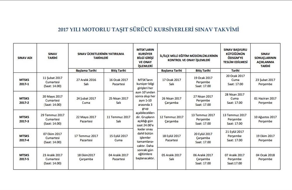 Milli Eğitim Bakanlığı 2017 takvimi ile bu yıl içerisinde gerçekleşecek tüm sınavları ve sonuç tarihini duyurdu. Takvime göre 7 Ekim tarihli ehliyet sınavı sonuçları 19 Ekim 2017 tarihinde açıklanacak.