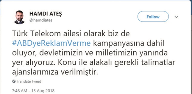 Türk Telekom Kurumsal İletişim Direktörü Hamdi Ateş de Twitter’dan yaptığı açıklamada kampanyaya katıldıklarını söyledi. Ateş paylaşımında şu ifadeleri kullandı: “Türk Telekom ailesi olarak biz de #ABDyeReklamVerme kampanyasına dahil oluyor, devletimizin ve milletimizin yanında yer alıyoruz. Konu ile alakalı gerekli talimatlar ajanslarımıza verilmiştir.”
