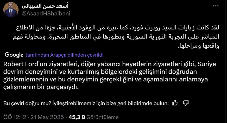 Suriye Dışişleri Bakanı Esad Hasan Şeybani kamuoyunda gündeme gelen ABD'nin eski Şam Büyükelçisi Robert Ford’un, Suriye Cumhurbaşkanı Ahmed Şara hakkında yaptığı açıklamalara ilişkin değerlendirmede bulundu.