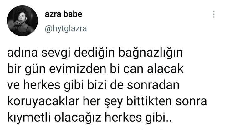 “Adına sevgi dediğin bağnazlığın bir gün evimizden bir can alacak ve herkes gibi bizi de sonradan koruyacaklar. Her şey bittikten sonra kıymetli olacağız herkes gibi”