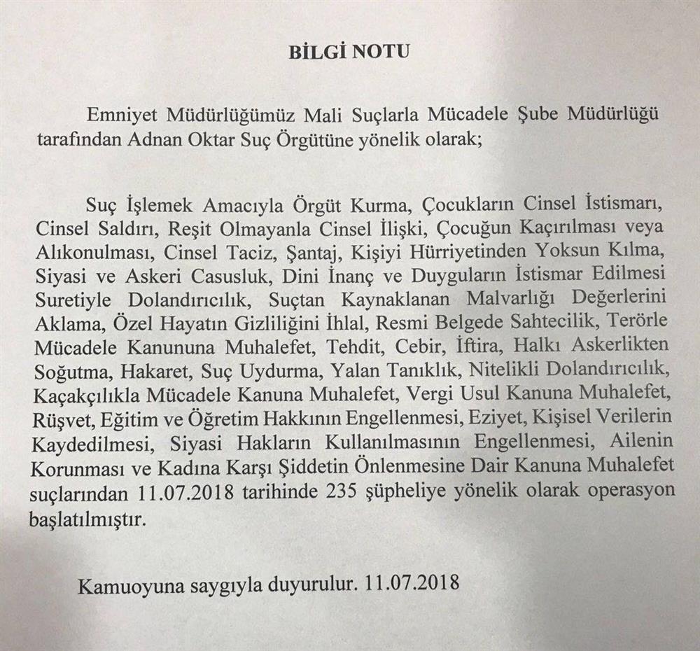 "Emniyet Müdürlüğümüz Mali Suçlarla Mücadele Şube Müdürlüğü tarafından Adnan Oktar Suç Örgütü'ne yönelik olarak; Suç işlemek amacıyla örgüt kurma, çocukların cinsel istismarı, cinsel saldırı, reşit olmayanla cinsel ilişki, çocuğun kaçırılması veya alıkonulması cinsel taciz, şantaj, kişiyi hürriyetinden yoksun kılma, siyasi ve askeri casusluk, dini inanç ve duyguların istismar edilmesi suretiyle dolandırıcılık, suçtan kaynaklanan malvarlığı değerlerini aklama, özel hayatın gizliliğini ihlal, resmi belgede sahtecilik, terörle mücadele kanununa muhalefet, tehdit, cebir, iftira, halkı askerlikten soğutma, hakaret, suç uydurma, yalan tanıklık, nitelikli dolandırıcılık, kaçakçılıkla mücadele kanuna muhalefet, vergi usul kanununa muhalefet, rüşvet, eğitim ve öğretim hakkının engellenmesi, eziyet, kişisel verilerin kaydedilmesi siyasi hakların kullanılmasının engellenmesi, ailenin korunması ve kadına karşı şiddetin engellenmesine dair kanuna muhalefet suçlarından 11.07 2018 tarihinde 235 şüpheliye yönelik olarak operasyon başlatılmıştır. Kamuoyuna saygıyla duyurulur.''