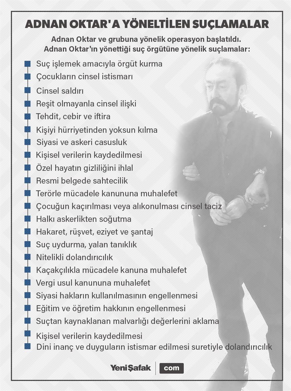 Kamuoyunda Adnan Hoca olarak bilinen Adnan Oktar ve grubuna yönelik suçlamalar arasında, "Suç işlemek amacıyla örgüt kurma, çocukların cinsel istismarı, cinsel saldırı, reşit olmayanla cinsel ilişki, çocuğun kaçırılması veya alıkonulması, cinsel taciz, şantaj, kişiyi hürriyetinden yoksun kılma, siyasi ve askeri casusluk, dini inanç ve duyguların istismar edilmesi suratiyle dolandırıcılık, suçtan kaynaklanan malvarlığı değerlerini aklama, özel hayatın gizliliğini ihlal, resmi belgede sahtecilik, Terörle Mücadele Kanunu'na muhalefet, tehdit, cebir, iftira, halkı askerlikten soğutma, hakaret, suç uydurma, yalan tanıklık, nitelikli dolandırıcılık, kaçakçılıkla mücadele kanununa muhalefet, vergi usul kanununa muhalefet, rüşvet, eğitim ve öğretim hakkının engellenmesi, eziyet, kişisel verilerin kaydedilmesi, siyasi hakların kullanılmasının engellenmesi, ailenin korunması ve kadına karşı şiddetin önlenmesine dair kanuna muhalefet" yer alıyor.