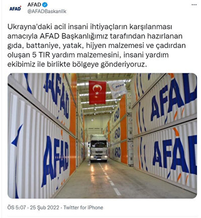 "Ukrayna'daki acil insani ihtiyaçların karşılanması amacıyla AFAD Başkanlığımız tarafından hazırlanan gıda, battaniye, yatak, hijyen malzemesi ve çadırdan oluşan 5 TIR yardım malzemesini, insani yardım ekibimiz ile birlikte bölgeye gönderiyoruz