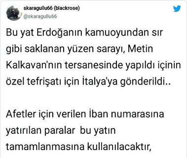 Sosyal medyadaki yalan terörü her geçen gün büyüyor. İsmi açıklanmayan yabancı uyruklu bir müşteri için Antalya'da üretilen lüks yatın, Cumhurbaşkanına ait olduğu yalanı dolaşıma sokuldu. Üretici firma da yabancı bir kişi için üretildiğini doğrulamasına rağmen, "Yat afetler için toplanan bağışlarla yapıldı" gibi birçok yalan bilgi, sahte hesaplar tarafından paylaşıldı.