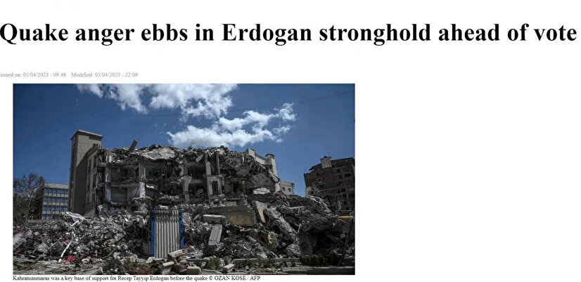 başlıklı haberinde bölgeden vatandaşların görüşlerine yer verdi. Deprem bölgesinde mağazası bulunan esnaf Latif Dalyan AFP’ye yaptığı açıklamada "Bu ülkeyi yeniden ayağa kaldırabilecek bir kişi varsa, o da Recep Tayyip Erdoğan'dır. Allah her ülkeye kendisi gibi bir lider nasip etsin” dedi. Haberde deprem bölgesindeki öfkeni yerini “Erdoğan’a duyulan güvene bıraktığı” ifade edildi.