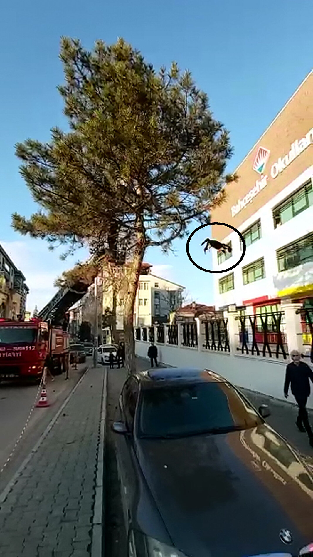 Olay yerine gelen itfaiye ekipleri kurtarma çalışması yaptığı sırada, kedi yaklaşık 9 metre yükseklikteki ağaç dalından yere atladı.