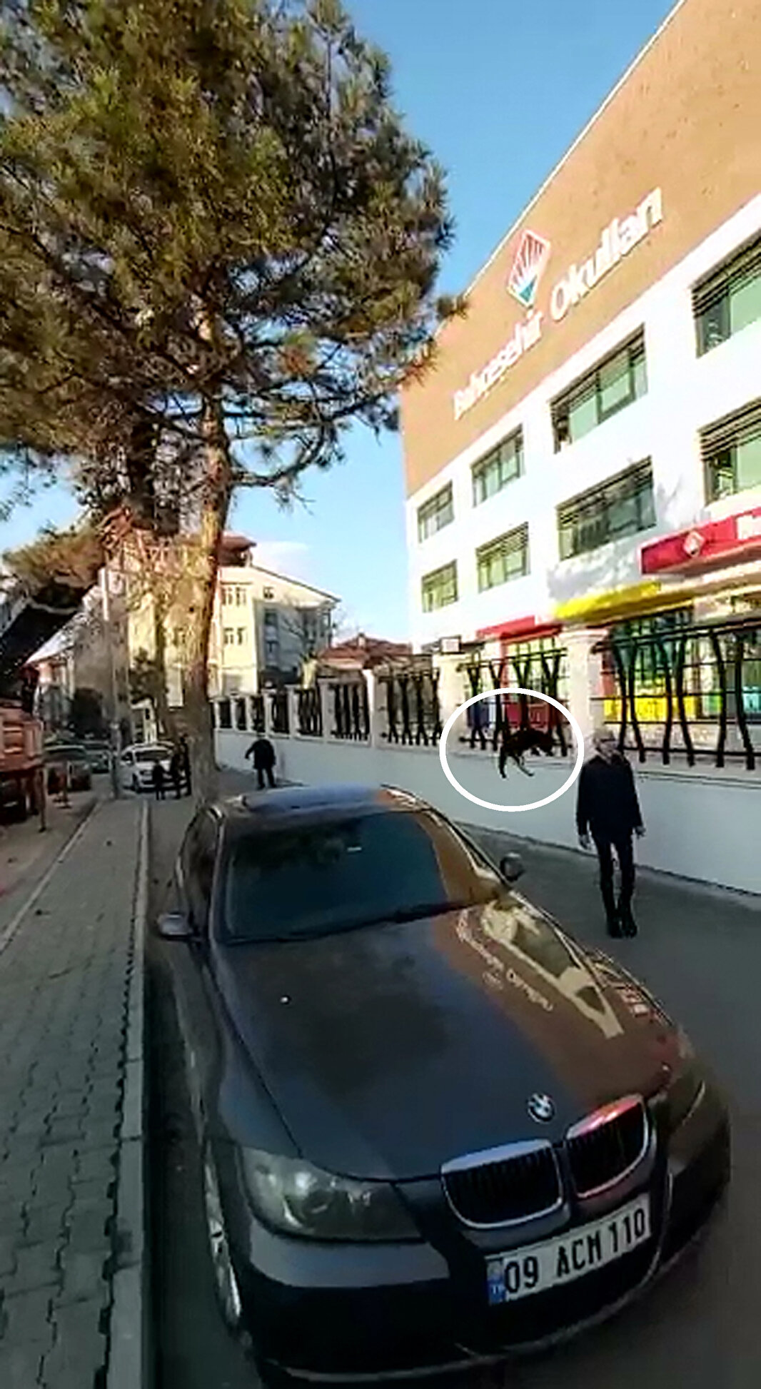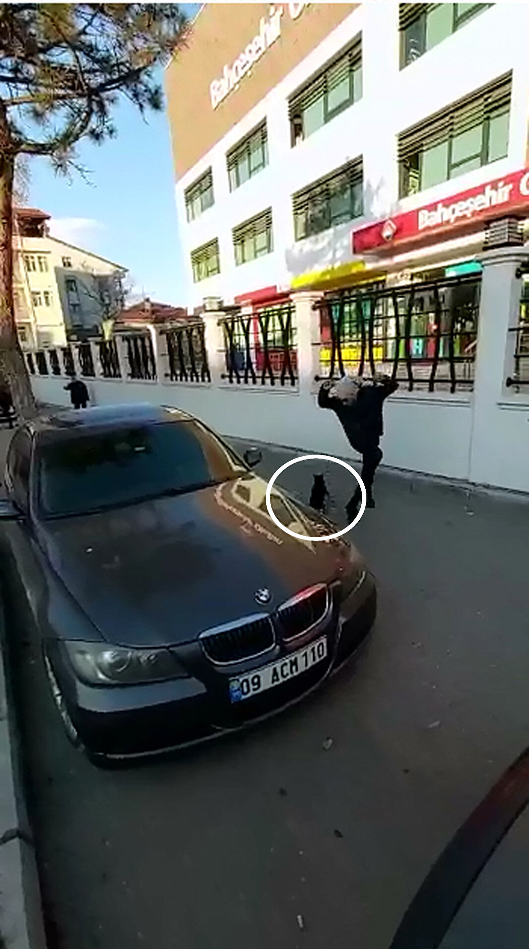 Tam o anda yoldan yürüyen çocuğun üzerine düşen kedi, ardından hızla uzaklaştı. Çocuk büyük korku yaşarken o anlar cep telefonu kamerasına yansıdı.