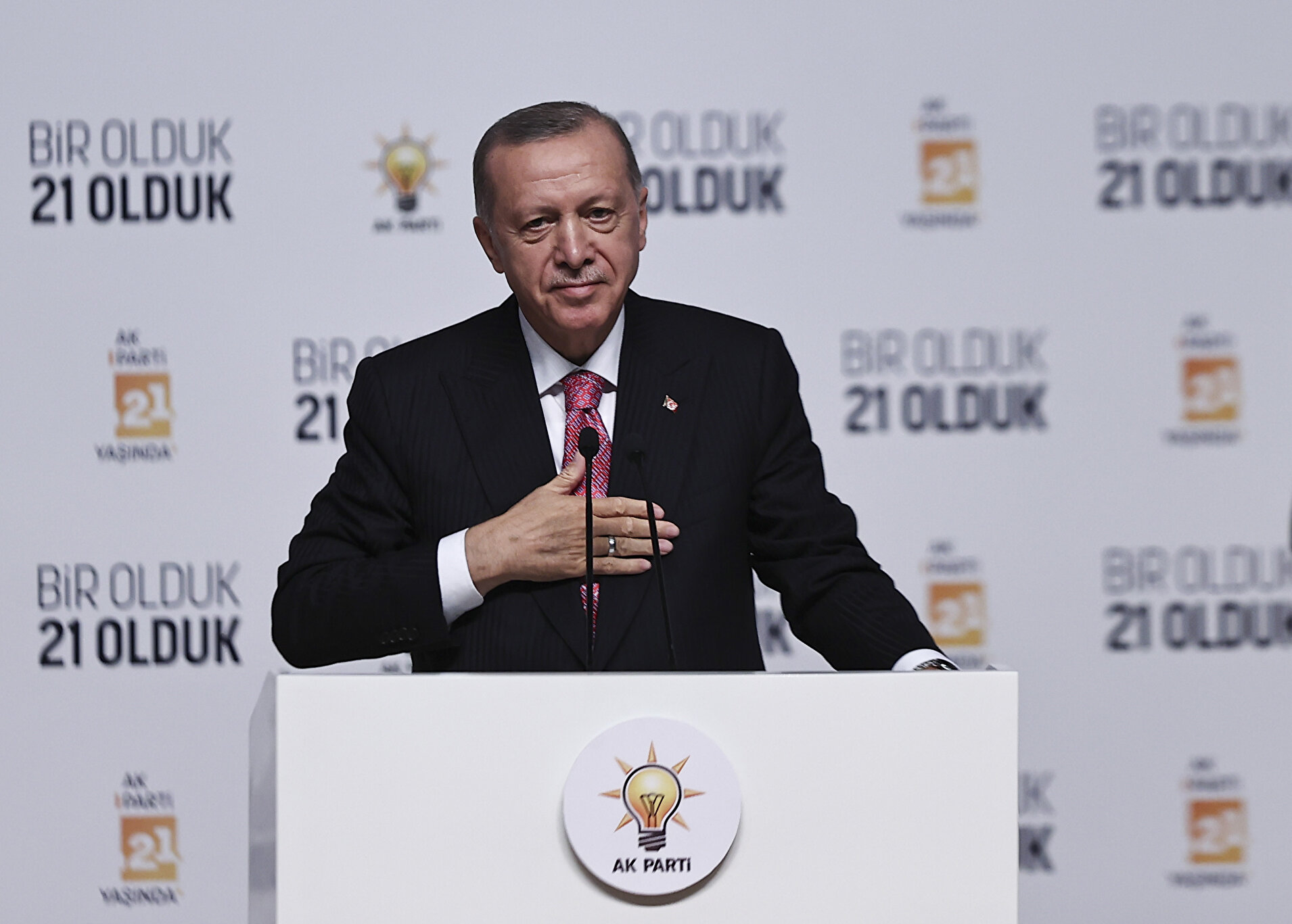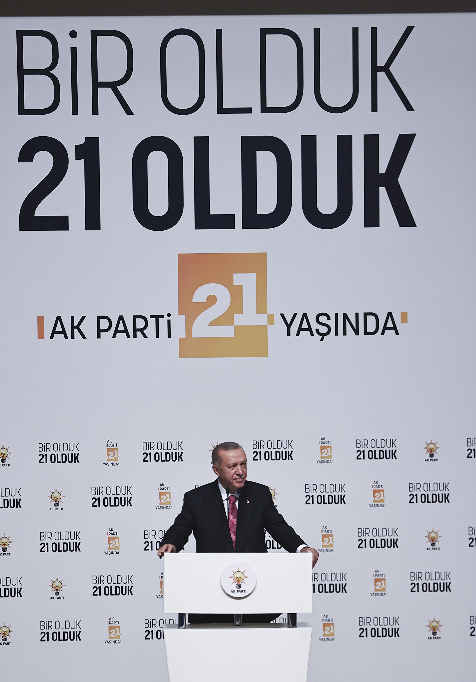 Erdoğan, partisinin, ATO Congresium'da düzenlenen 21. kuruluş yıl dönümü kutlamasında yaptığı konuşmada, parti üyelerinin yol arkadaşlığı için Allah'a hamdettiğini söyledi.