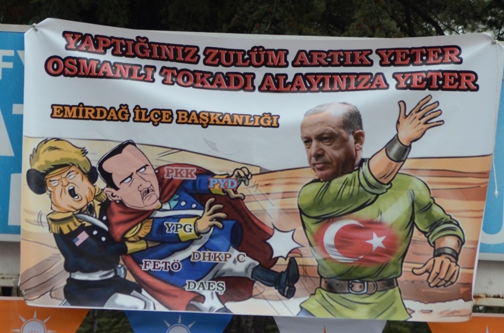 Erdoğan’ın yer aldığı ve ’Osmanlı tokadı’ savurduğu kısımdaki figürlerin üzerinde ise PKK, YPG, PYD, FETÖ, DHKP-C ve DEAŞ terör örgütlerinin isimleri yer alıyor. Pankartın üzerinde ise, "Yaptığınız zulüm artık yeter, Osmanlı tokadı alayınıza yeter" ifadesi yer aldı.