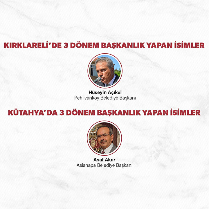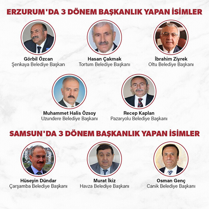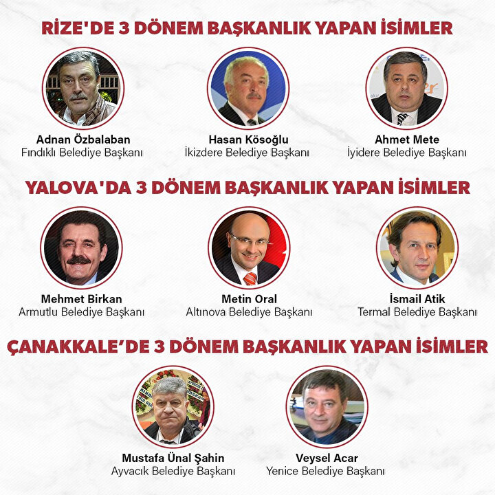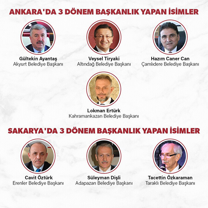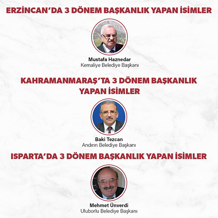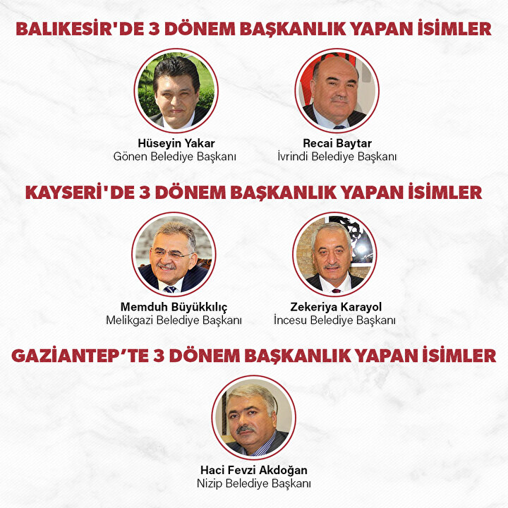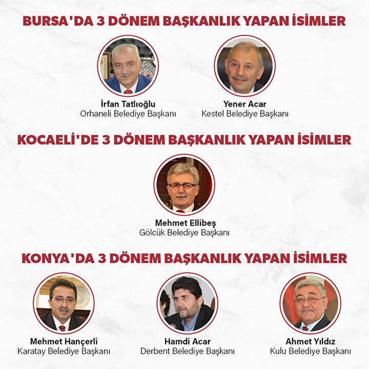 Cumhurbaşkanı Erdoğan ‘‘Üç dönem belediye başkanlığı yapmış arkadaşlarımızı büyük oranda istirahate çekeceğiz’ açıklamasını yaptı. AK Parti'de 3 dönemdir görev yapan 92 belediye başkanı var. Kocaeli Büyükşehir Belediye Başkanı İbrahim Karaosmanoğlu ve Bolu Belediye Başkanı Alaaddin Yılmaz'ın yanı sıra İstanbul'dan 8, Ankara'dan 4, Erzurum'dan 5 ilçenin belediye başkanı üçüncü dönemlerini dolduracak.