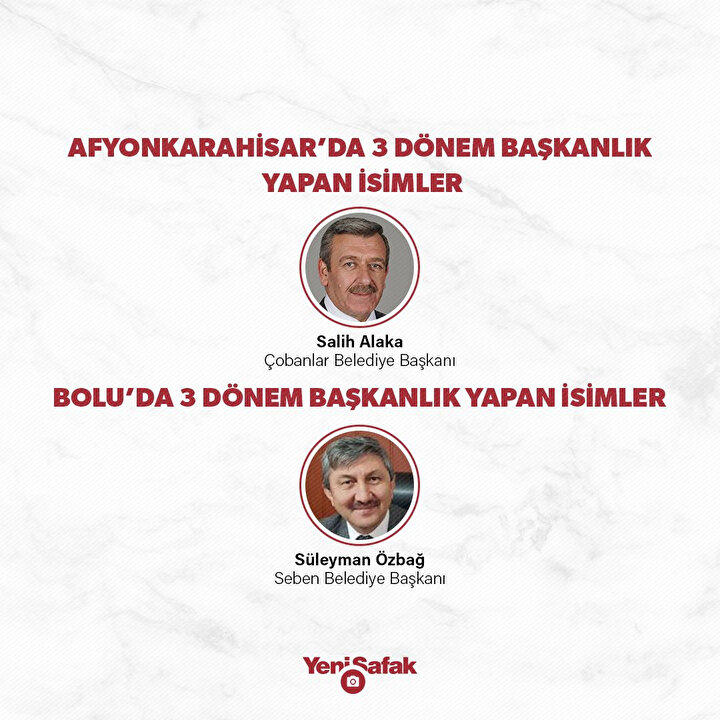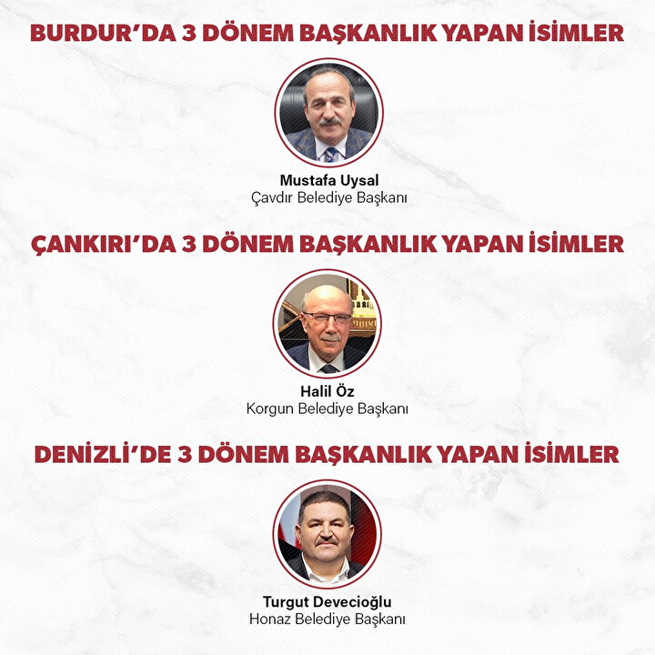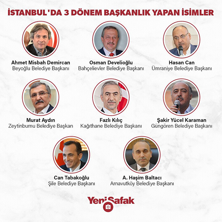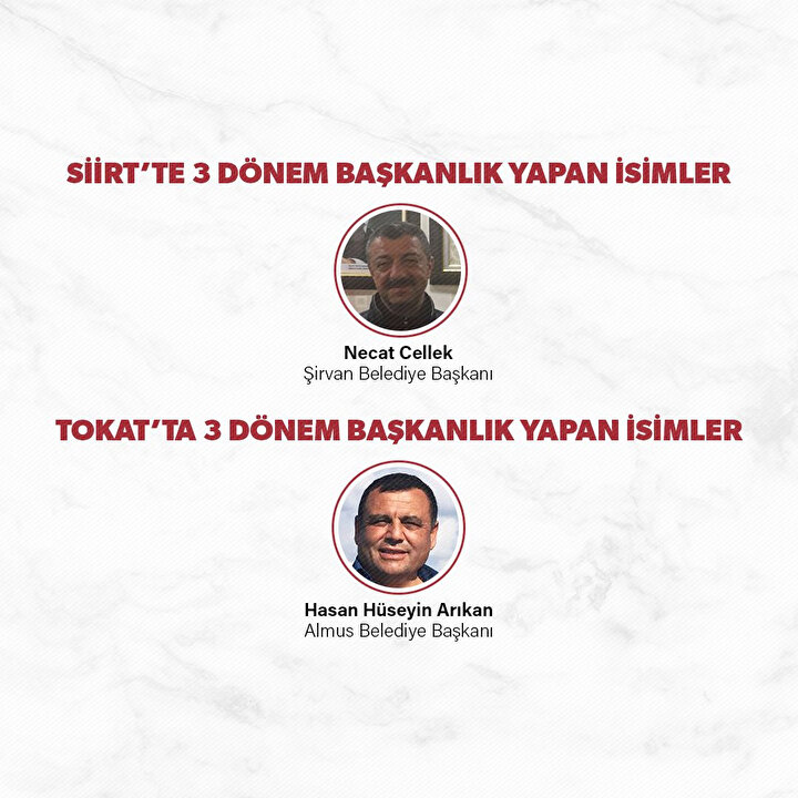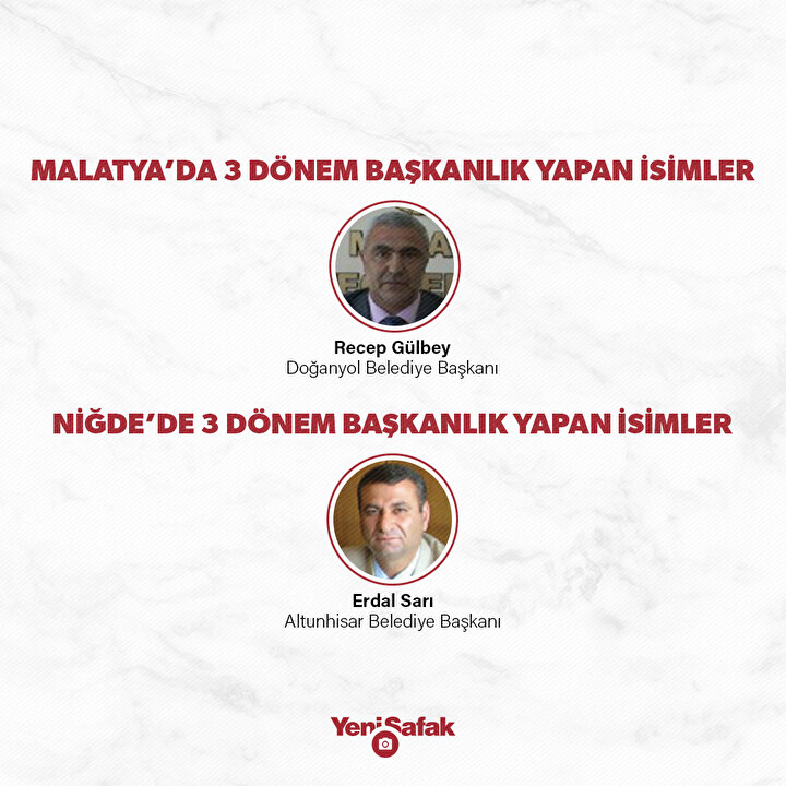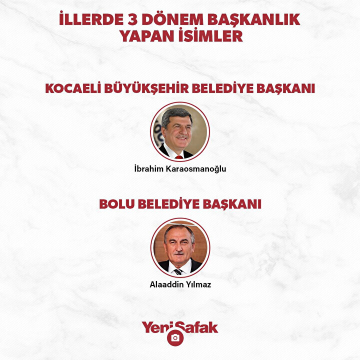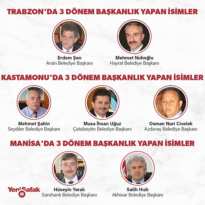 Cumhurbaşkanı Erdoğan ‘‘Üç dönem belediye başkanlığı yapmış arkadaşlarımızı büyük oranda istirahate çekeceğiz’ açıklamasını yaptı. AK Parti'de 3 dönemdir görev yapan 92 belediye başkanı var. Kocaeli Büyükşehir Belediye Başkanı İbrahim Karaosmanoğlu ve Bolu Belediye Başkanı Alaaddin Yılmaz'ın yanı sıra İstanbul'dan 8, Ankara'dan 4, Erzurum'dan 5 ilçenin belediye başkanı üçüncü dönemlerini dolduracak.