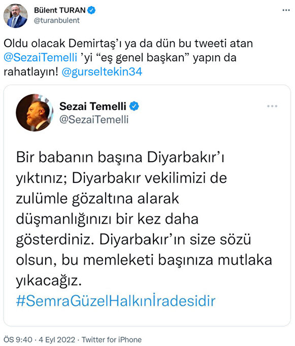 "Oldu olacak Demirtaş’ı ya da dün bu tweeti atan Sezai Temelli'yi 'eş genel başkan' yapın da rahatlayın!"