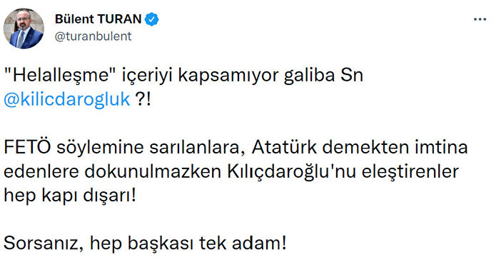 "FETÖ söylemine sarılanlara, Atatürk demekten imtina edenlere dokunulmazken Kılıçdaroğlu'nu eleştirenler hep kapı dışarı! Sorsanız, hep başkası tek adam!"