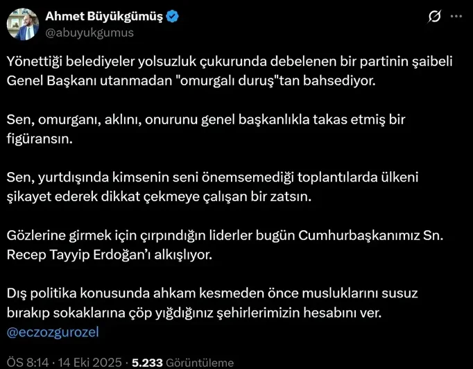 CHP lideri Özgür Özel, Cumhurbaşkanı Erdoğan'ı hedef alıp, 'omurgasız' imasında bulundu. AK Parti Genel Başkan Yardımcısı ve Teşkilat Başkanı Ahmet Büyükgümüş, Özel'in bu sözlerine sert çıktı. "Sen, omurganı, aklını, onurunu genel başkanlıkla takas etmiş bir figüransın." diyen Büyükgümüş, "Gözlerine girmek için çırpındığın liderler bugün Cumhurbaşkanımız Sn. Erdoğan’ı alkışlıyor." ifadelerini kullandı.
