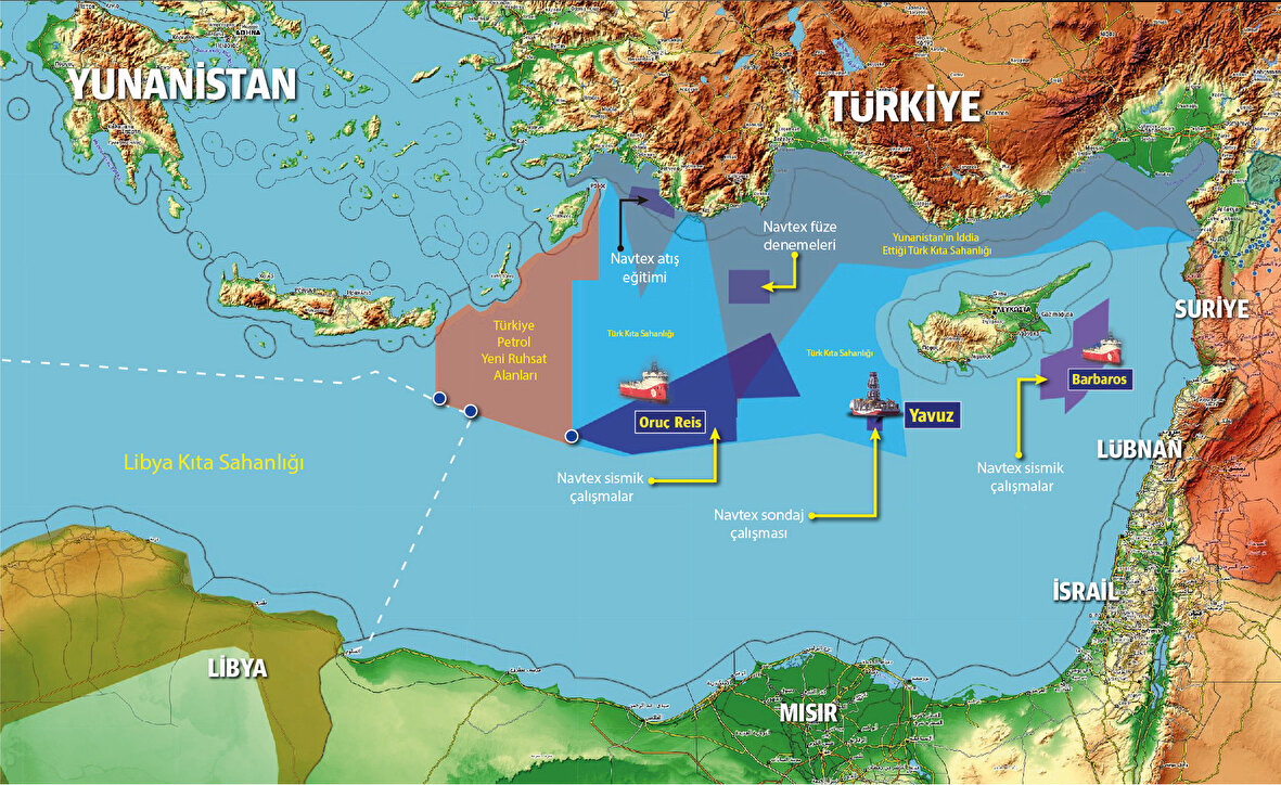 Dışişleri Bakanlığı, Türkiye’nin, Birleşmiş Milletler’e (BM) bildirdiği Doğu Akdeniz’deki deniz sınırları içinde, Oruç Reis sismik araştırma gemisinin faaliyet yürüttüğü bölgeyi gösteren haritayı paylaştı. Dışişleri Bakanlığı İkili Siyasi İşler ve Denizcilik-Havacılık-Hudut Genel Müdürü Büyükelçi Çağatay Erciyes, sosyal medya hesabındaki paylaşımında Yunanistan’ın Meis adasından kaynaklı iddialarına da net cevaplar verdi. Büyükelçi Erciyes şunları yazdı: “Yunanistan ana karasına 580 kilometre uzaklıktaki Kastellorizo (Meis) adlı 10 kilometrekarelik Yunan adası nedeniyle Yunanistan, 40 bin kilometrekare deniz yetki alanı talep ederek, Oruç Reis’i durdurmaya ve Doğu Akdeniz’i Türkiye’ye kapatmaya çalışmaktadır. Yunanistan’ın bu iddiası uluslararası hukukla bağdaşmıyor. Bu maksimalist iddia, uluslararası hukukla uyumlu değildir, hakkaniyet ilkesine aykırıdır. Ancak Yunanistan, Avrupa Birliği ve ABD’den bu iddiayı desteklemesini ve Türkiye’ye, meşru hidrokarbon faaliyetlerini durdurması için baskı yapmasını istiyor. Bu kabul edilebilir ve makul değildir. Bu ülkeler bunun yerine Yunanistan’dan adaletsiz, haksız ve absürt iddialarına son vermesini istemelidir. Bölgede gerilim yaratan Türkiye değil, bu tür maksimalist iddiaları nedeniyle Yunanistan’dır.”