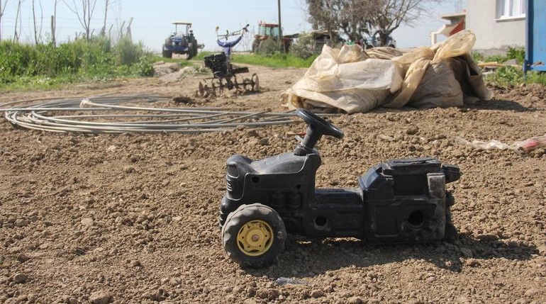 İddiaya göre, arazisinin bir bölümünü sera yapan Abüzer Şahin (22), traktörle toprağı sürmeye başladı. Oyuncak arabasıyla civarda oynayan kuzeni Hasan Ali Şahin de (2) bir süre tarlada oynayıp uyuyakaldı. Şahin, tarlayı sürmeye devam ederken onu görmeyerek, küçük çocuğun üzerinden geçti.