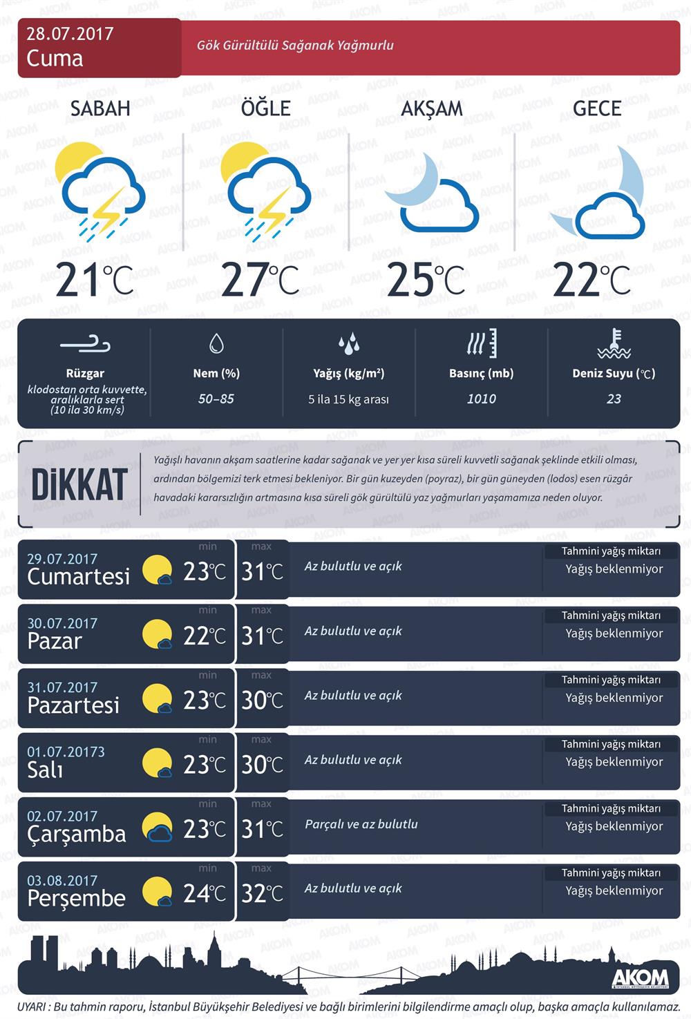 Afet Koordinasyon Merkezi (AKOM); Kartal, Pendik, Adalar ve Tuzla için şiddetli yağış uyarısı yaptı.