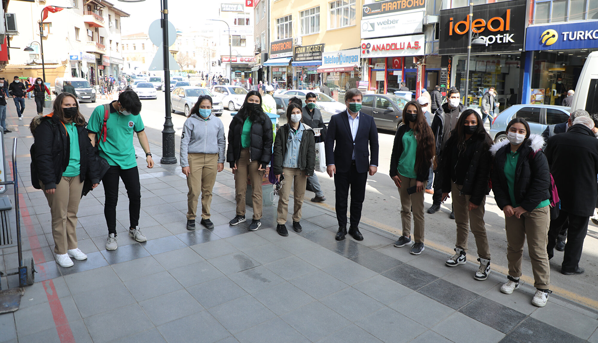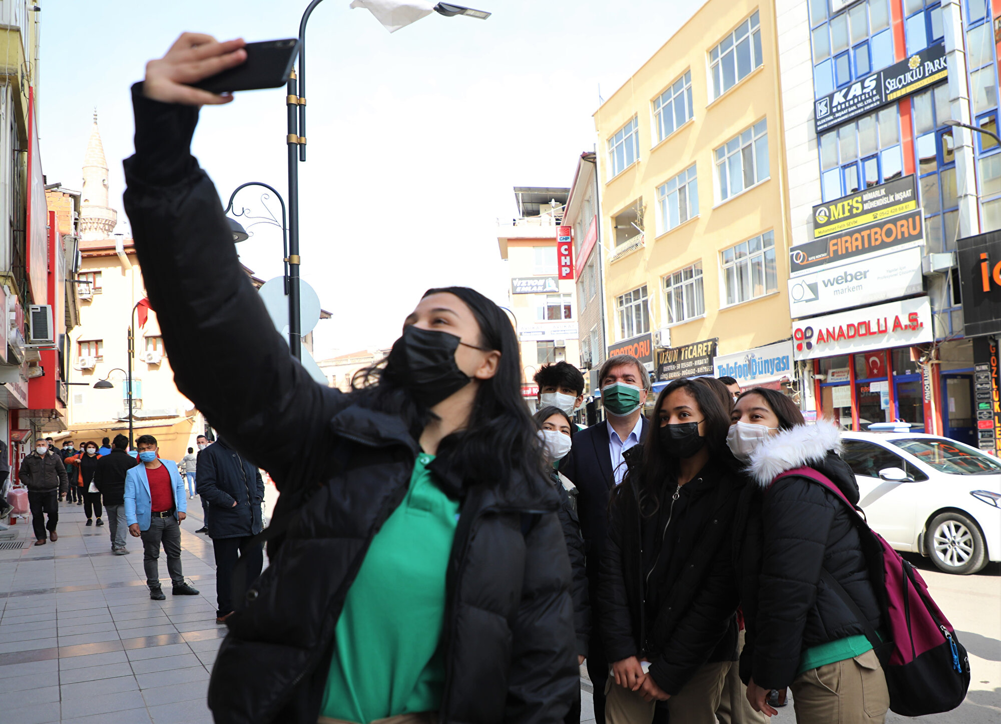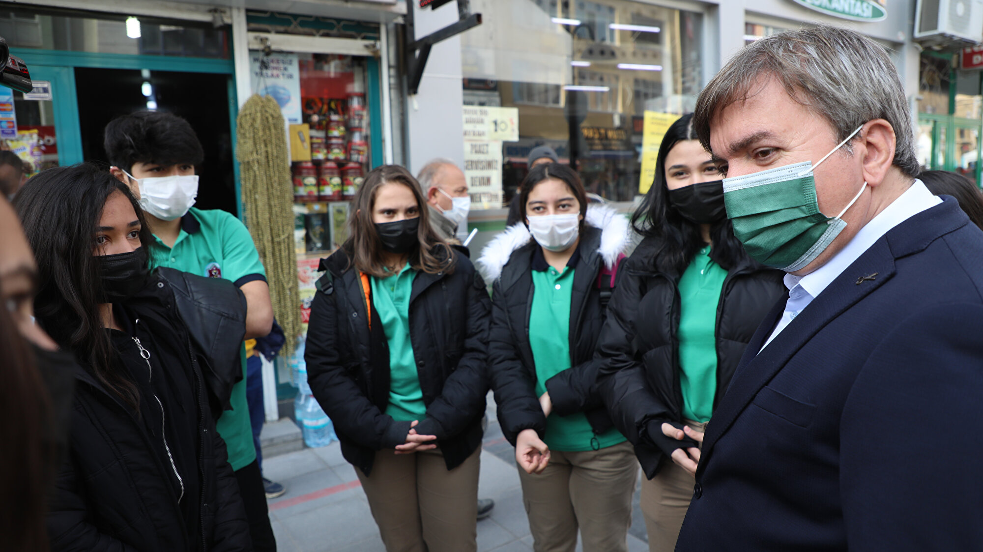 Eski Sanayi Caddesi'nde kurallara uyulup uyulmadığını kontrol eden Vali Aydoğdu, karşılaştığı kız öğrencilerle, yüz yüze sınavlar, pandemi ve gençlik üzerine sohbet etti.