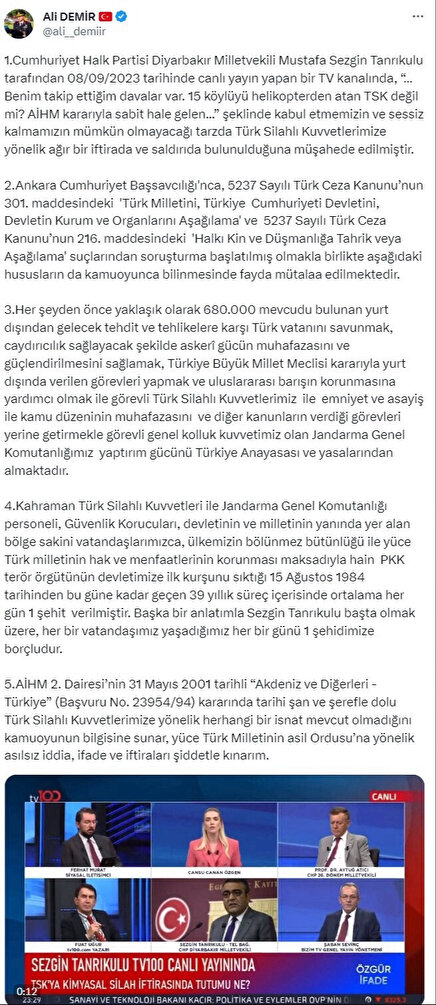 "1.Cumhuriyet Halk Partisi Diyarbakır Milletvekili Mustafa Sezgin Tanrıkulu tarafından 08/09/2023 tarihinde canlı yayın yapan bir TV kanalında, “…Benim takip ettiğim davalar var. 15 köylüyü helikopterden atan TSK değil mi? AİHM kararıyla sabit hale gelen...” şeklinde kabul etmemizin ve sessiz kalmamızın mümkün olmayacağı tarzda Türk Silahlı Kuvvetlerimize yönelik ağır bir iftirada ve saldırıda bulunulduğuna müşahede edilmiştir.