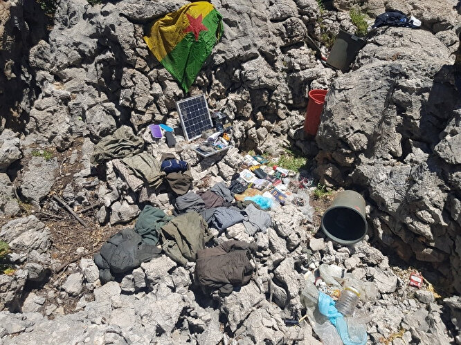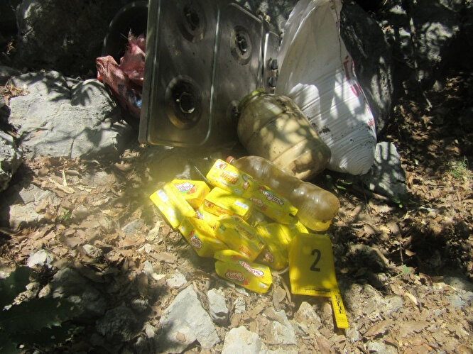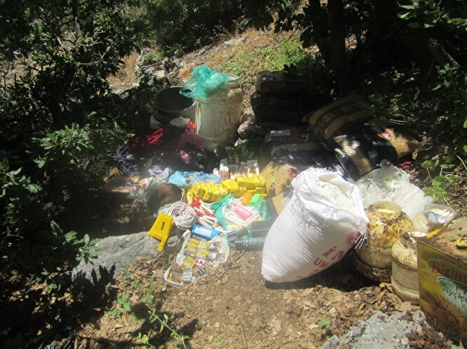 Bidonlarda 1 adet örgüt simgeli bez parçası, 6 adet batarya, 2 adet güneş paneli, 2 adet kablo bağlı pil bloğu, 1 adet radyo, 5 adet not defteri, 12 adet örgütsel kitap, 8 adet el feneri, 400 metre kablo, 1 adet akım ölçer, 1 adet ses kayıt cihazı, 1 adet kuzineli soba, 2 adet kuru akü,1 adet dörtlü ocak,2 çift ayakkabı, 2 adet hafızalı radyo, 1 adet radyo mp3, 1 adet ışıldak, 1 adet akü, 14 adet büyük boy pil, 61 adet küçük pil, 1 adet keser, 1 adet kazma, 1.250 kilogram muhtelif yaşam malzemesi ele geçirildi.