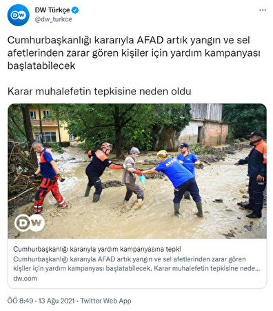 Türkiye'de faaliyet gösteren yabancı medya kuruluşlarından Alman Deutsche Welle (DW), yangın ve sel afetlerinden zarar gören vatandaşlar için başlatılan yardım kampanyası üzerinden algı oluşturmaya çalıştı. Almanya'daki benzer adım için "Ülke çapında yardım kampanyası başlatıldı" diyerek 'düz' bir şekilde haberi veren DW, söz konusu Türkiye olduğunda kullandığı dille tepki oluşturmaya çalıştı.