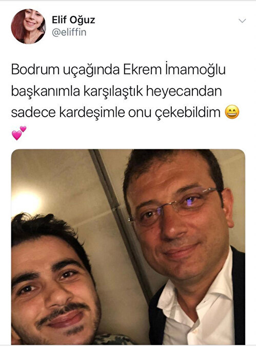 Dün Nevşehir'in Hacıbektaş ilçesinde düzenlenen, 60'ıncı ulusal 30'uncu uluslararası Hacı Bektaş-ı Veli'yi anma törenlerine katılan Ekrem İmamoğlu'nun akşam saatlerinde Muğla'nın Bodrum ilçesine gittiği ortaya çıktı. Elif Oğuz isimli twitter kullanıcısı dün akşam saatlerinde Bodrum uçağında Ekrem İmamoğlu ile karşılaştıklarını yazdı ve kardeşi ile uçakta çekildikleri fotoğrafı paylaştı. Elif Oğuz daha sonra paylaşımını ve fotoğrafı sildi.