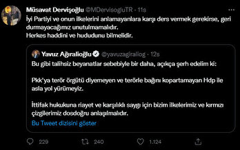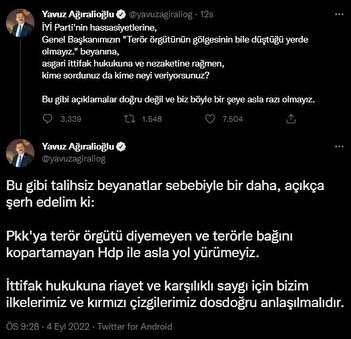“İYİ Parti'nin hassasiyetlerine, Genel Başkanımızın 'Terör örgütünün gölgesinin bile düştüğü yerde olmayız.' beyanına, asgari ittifak hukukuna ve nezaketine rağmen, kime sordunuz da kime neyi veriyorsunuz? Bu gibi açıklamalar doğru değil ve biz böyle bir şeye asla razı olmayız. Bu gibi talihsiz beyanatlar sebebiyle bir daha, açıkça şerh edelim ki: PKK'ya terör örgütü diyemeyen ve terörle bağını kopartamayan HDP ile asla yol yürümeyiz. İttifak hukukuna riayet ve karşılıklı saygı için bizim ilkelerimiz ve kırmızı çizgilerimiz dosdoğru anlaşılmalıdır.”