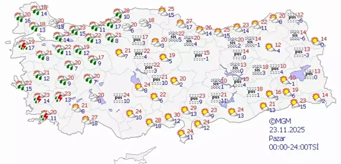 Meteoroloji Genel Müdürlüğü'nün (MGM) tahminlerine göre bugün yurt genelinde İzmir, Aydın, Muğla ve Edirne'de aralıklarla sağanak yağış görülecek. Bu 4 il dışında yurt genelinde hava açık olacak. Yarından itibaren ise batı illerinden başlayacak yağışlar tüm yurda yayılacak.