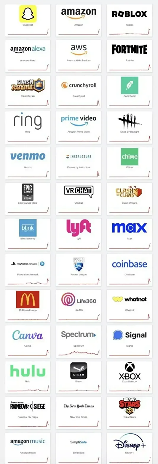 Snapchat, Amazon Web Services, Epic Games Store, Zoom, Fortnite, Udemy, Ring, Clash Royale, PlayStation Network, Life360, Signal, Canva.