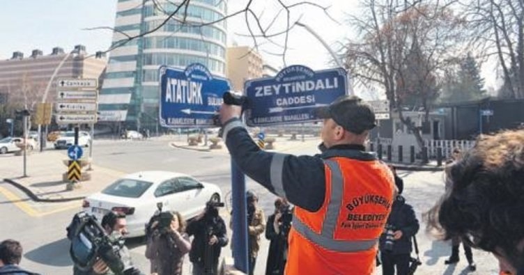 Amerika Birleşik Devletleri'nin (ABD) Ankara Büyükelçiliği'nin bulunduğu caddenin yeni adına ait tabela takılM. Nevzat Tandoğan Caddesi olarak bilinen cadde bundan sonra Afrin'de TSK'nın başarılı şekilde sürdürdüğü, "Zeytin dalı" operasyonu'nun adını taşıyacak. Ankara Büyükşehir Belediye Meclisi'nce alınan karar dün uygulandı. Büyükşehir Belediyesi Fen İşleri Daire Başkanlığı'na bağlı Numarataj Şube Müdürlüğü ekipleri caddenin adının bulunduğu direkteki "Nevzat Tandoğan" isim tabelasını indirerek yerine "Zeytin Dalı" yazılı tabelayı yerleştirdi.