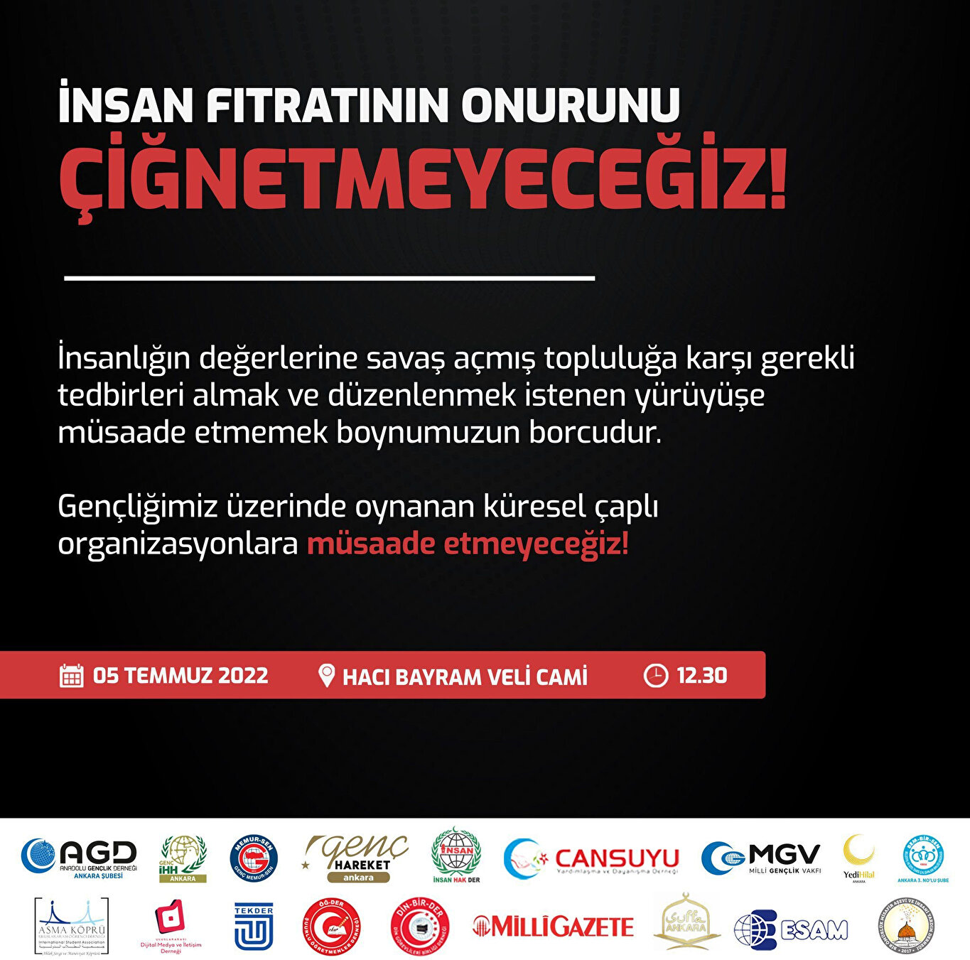 Ankara'da yapılacağı duyurulan LGBT yürüyüşüne karşı STK'lar bir araya geldiler. Haziran ayının son haftalarında düzenlenmeye başlayan, doğrudan aile yapısını ve toplumun ahlakını hedef alan pek çok LGBT+ bireylerin katıldığı sözde ‘onur yürüyüşü’ için bu senede hazırlıklar yapılıyor. Planlanan organizasyona pek çok sivil toplum kuruluşu 'Gençliğimiz üzerinde oynanan küresel çaplı organizasyonlara müsaade etmeyeceğiz.' diyerek tepki gösterdi.