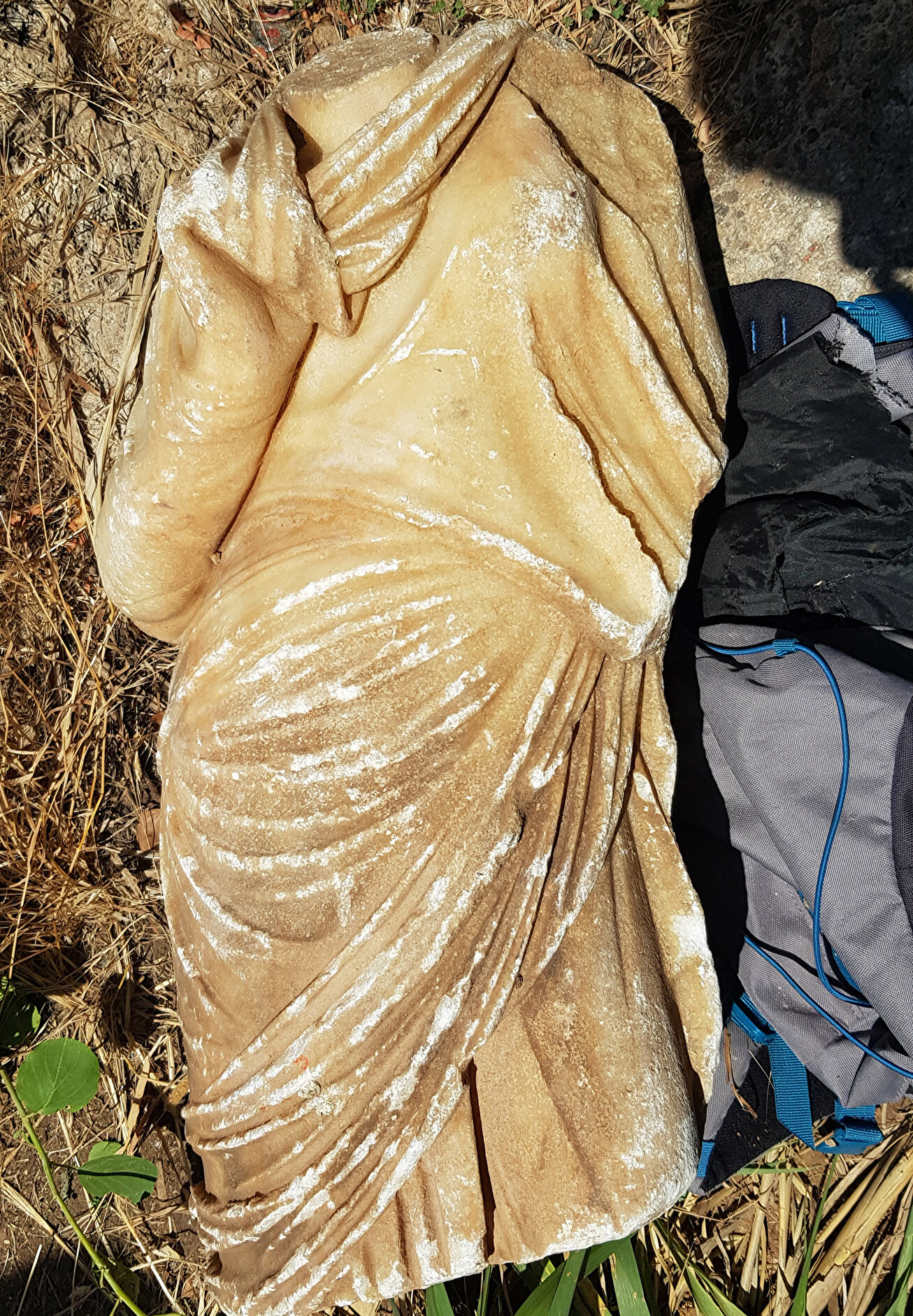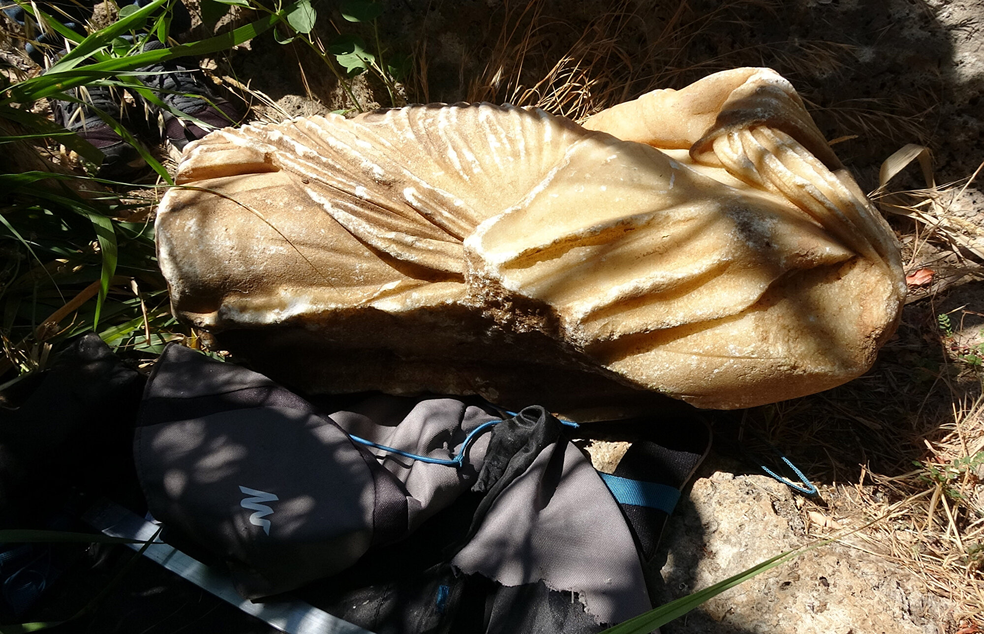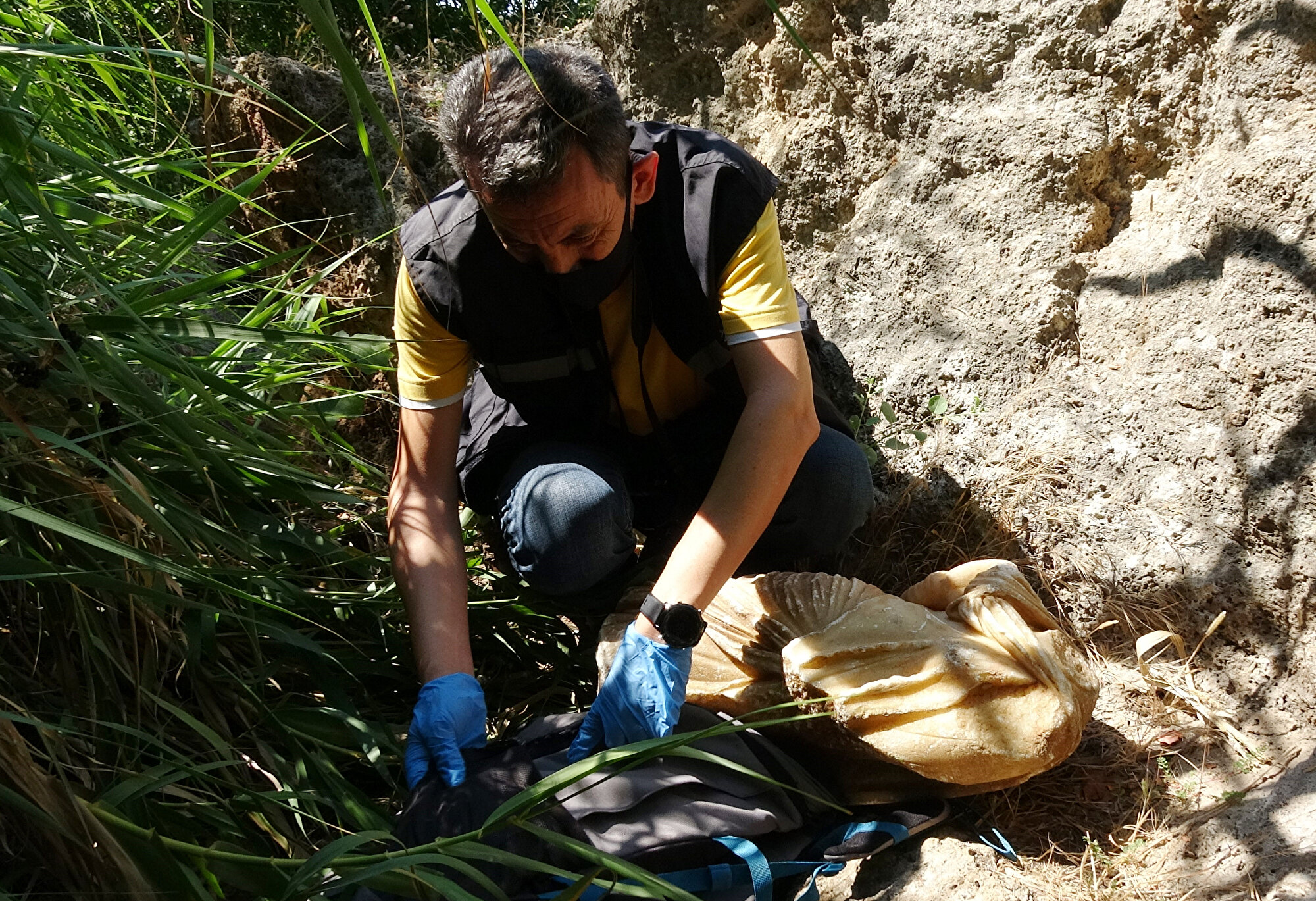 Çantanın yırtık bir noktasından içine bakan Emrah Demir, heykel olduğunu gördü. Demir, durumu hemen polis ekiplerine haber verdi. Olay yerine, Antalya Müzesi görevlileri ve polis ekipleri geldi. 40 metrelik falezlerdeki patika yoldan inen ekipler, ilk incelemelerini gerçekleştirdi.