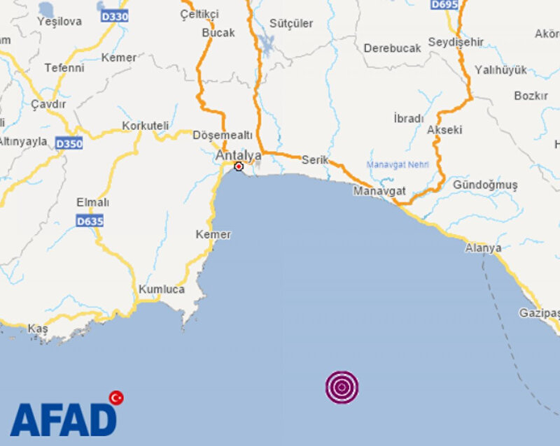 AFAD: Antalya'nın Kumluca ilçesi açıklarında 4.5 büyüklüğünde deprem meydana geldi. Paniğe neden olan sarsıntıyla yapılan ilk açıklamaya göre; herhangi bir olumsuzluğa rastlanmadığı bildirildi.