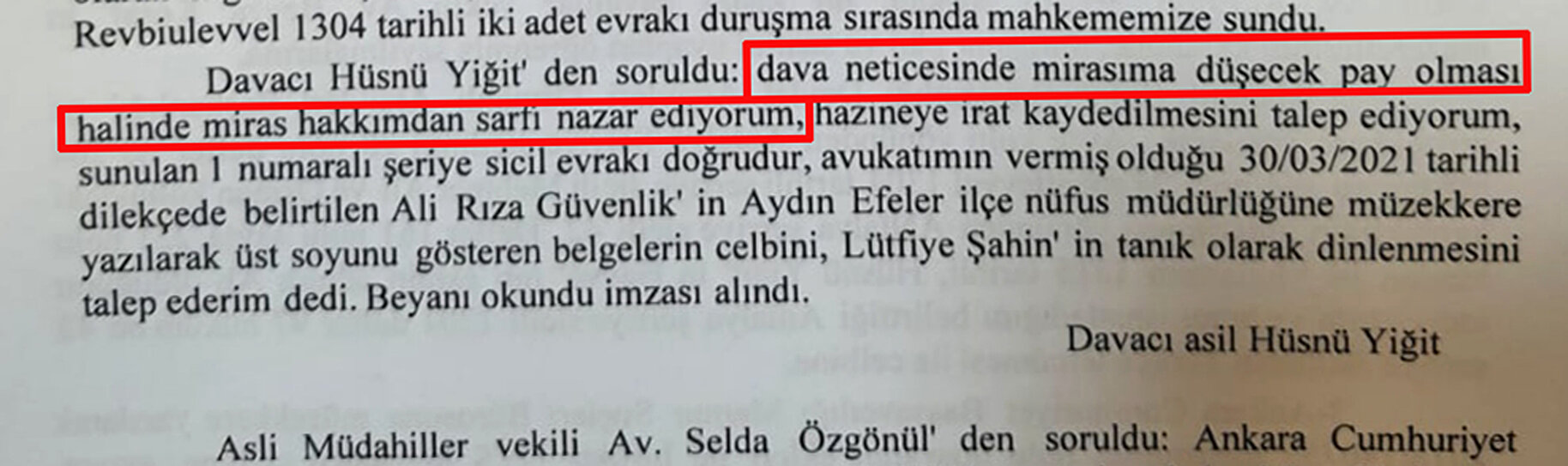 Avukat Gülen Dokuzoğlu Can ise Hüsnü Yiğit'in miras hakkından sarfı nazar ettiğini beyan ettiğini, mirastan feragat ettiği için davacı sıfatı kalmadığını, davanın asli müdahiller yönünden devam etmesi talebinde bulundu.