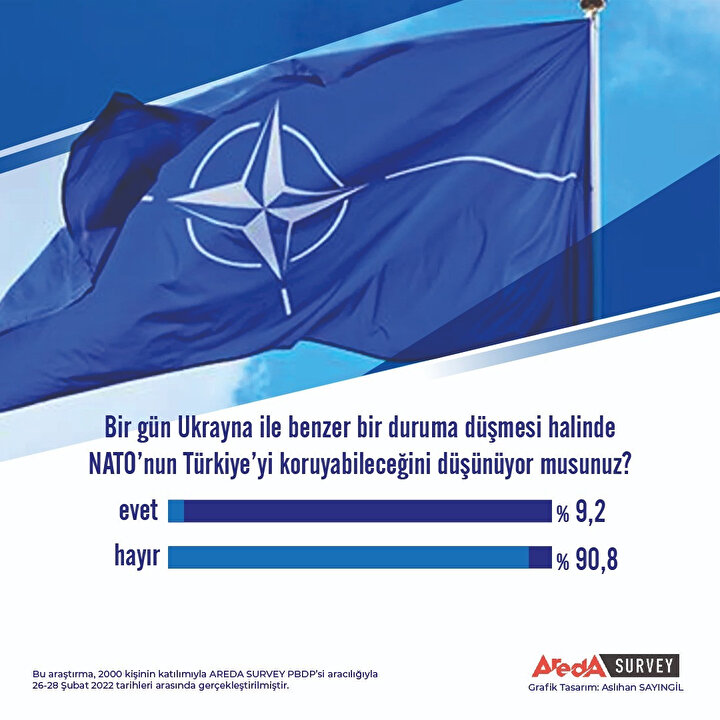 Araştırma şirketi Areda Survey, 'Ukrayna ile benzer duruma düşmesi halinde NATO’nun Türkiye’yi koruyabileceğine inanıyor musunuz' sorusuna yüzde 90’lık bir oranla, Türkiye’nin Ukrayna ile benzer bir duruma düşmesi halinde NATO’nun Türkiye’ye destek vermeyeceğini düşündüğü tespit edildi. Araştırma sonuçlarına göre, NATO’nun böyle bir durumda Türkiye’ye destek vereceğini düşünenlerin oranı yalnızca yüzde 9,2 düzeyinde seyretti.