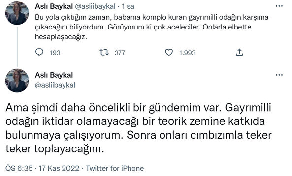 Geçtiğimiz günlerde CHP'den istifa eden Eski CHP Genel Başkanı Deniz Baykal'ın kızı Aslı Baykal, ‘gayrimilli’ olarak nitelendirdiği eski partisine yönelik yeni bir açıklamada bulundu. Karşısına çıkan gayrimilli odakla hesaplaşacağını belirten Baykal, "Ama şimdi daha öncelikli bir gündemim var. Gayrimilli odağın iktidar olamayacağı bir teorik zemine katkıda bulunmaya çalışıyorum. Sonra onları cımbızımla teker teker toplayacağım." ifadelerini kullandı.