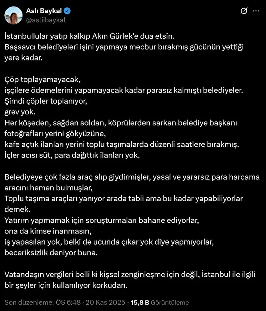 CHP eski Genel Başkanı merhum Deniz Baykal'ın kızı Aslı Baykal, Ekrem İmamoğlu çıkar amaçlı suç örgütü soruşturması sonrası, İstanbul'un belediyecilikte nasıl 'yeniden hizmete kavuştuğunu' anlattı. "İstanbullular yatıp kalkıp Akın Gürlek'e dua etsin." diyen Baykal, "Vatandaşın vergileri belli ki kişisel zenginleşme için değil, İstanbul ile ilgili bir şeyler için kullanılıyor korkudan." ifadelerini kullandı.