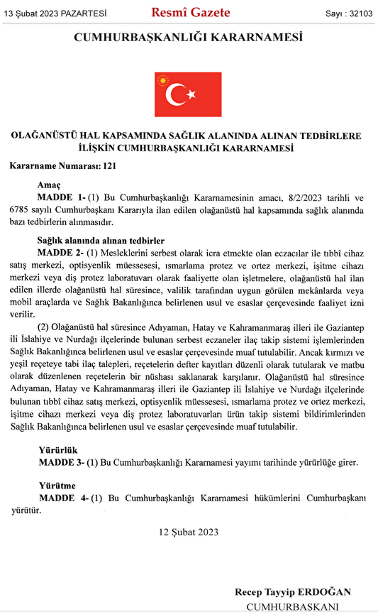 OHAL kapsamında sağlık alanında alınan tedbirlere ilişkin Cumhurbaşkanlığı Kararnamesi Resmi Gazete'de yayımlandı. Buna göre; eczacı, tıbbi cihaz satış merkezleri, optisyenler ve işitme cihazı merkezleri mobil hizmet verecek. Adıyaman, Hatay, Kahramanmaraş, İslahiye, Nurdağı'ndaki eczaneler ilaç takip sisteminden muaf olacak.