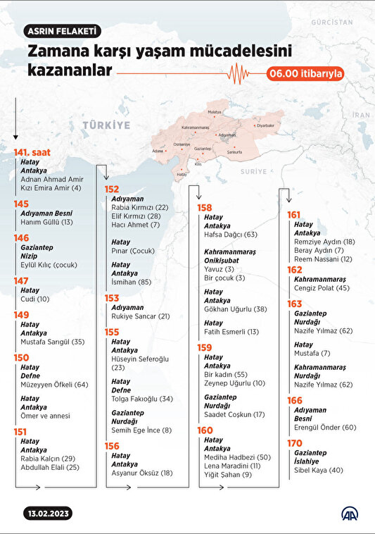 "Asrın felaketi" olarak nitelenen, Kahramanmaraş merkezli, 10 ili etkileyen 7,7 ve 7,6 büyüklüğündeki depremlerin ardından geçen 141'inci ve 163'üncü saatler arasında en az 41 kişi enkaz altından sağ çıkarıldı.