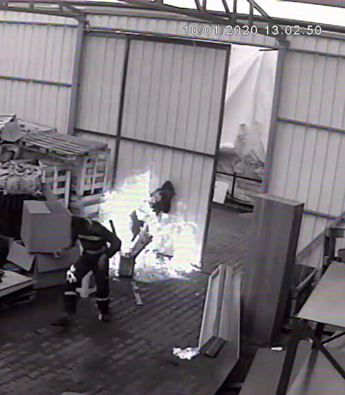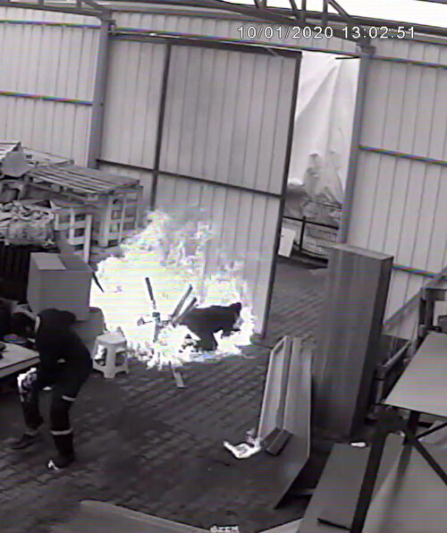 Angolalı gencin alevler içerisinde kaldığı anlar ve yanındaki işçinin alevlerden son anda kaçmayı başarması ise iş yerinin güvenlik kameralarına yansıdı.