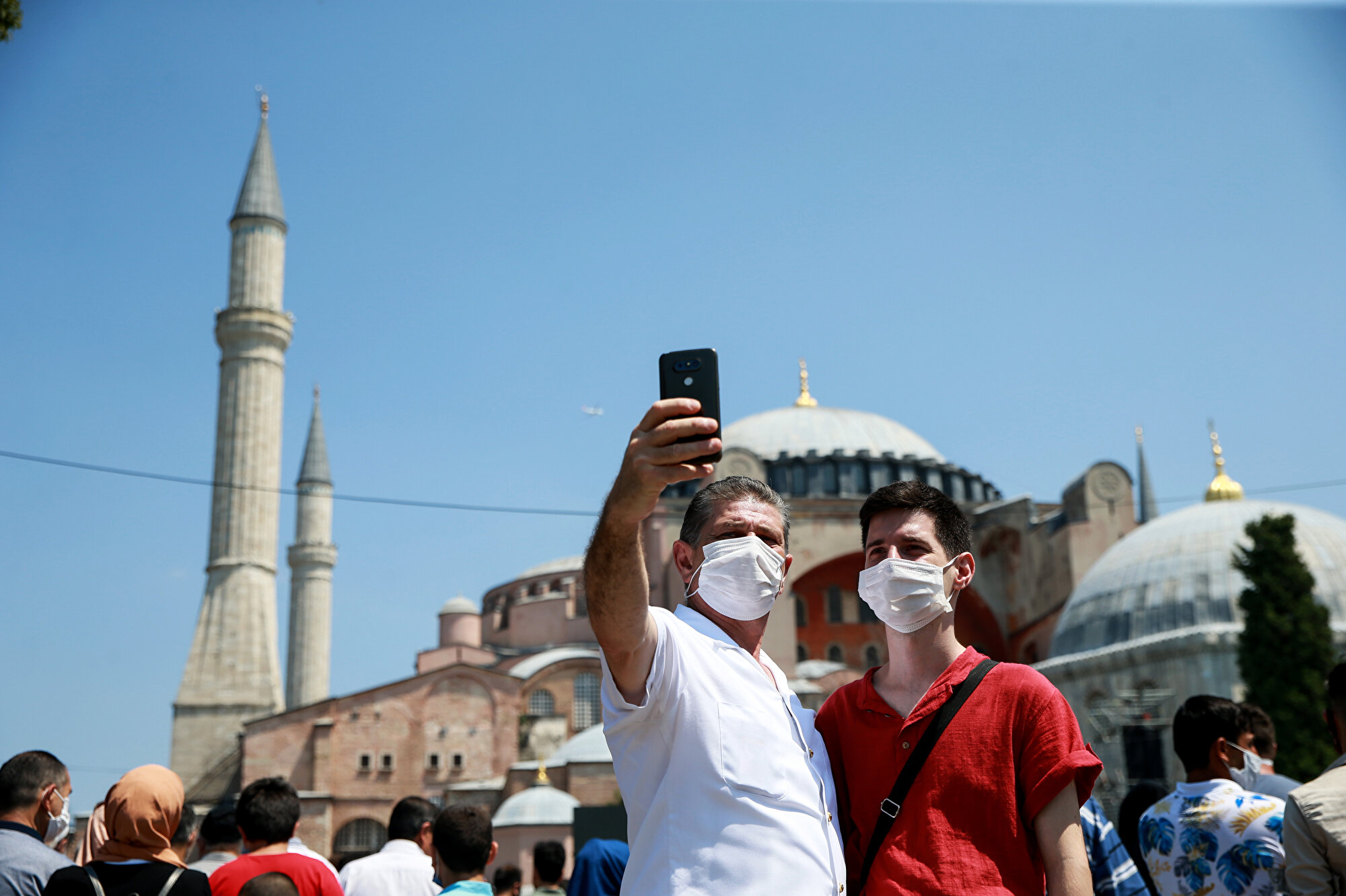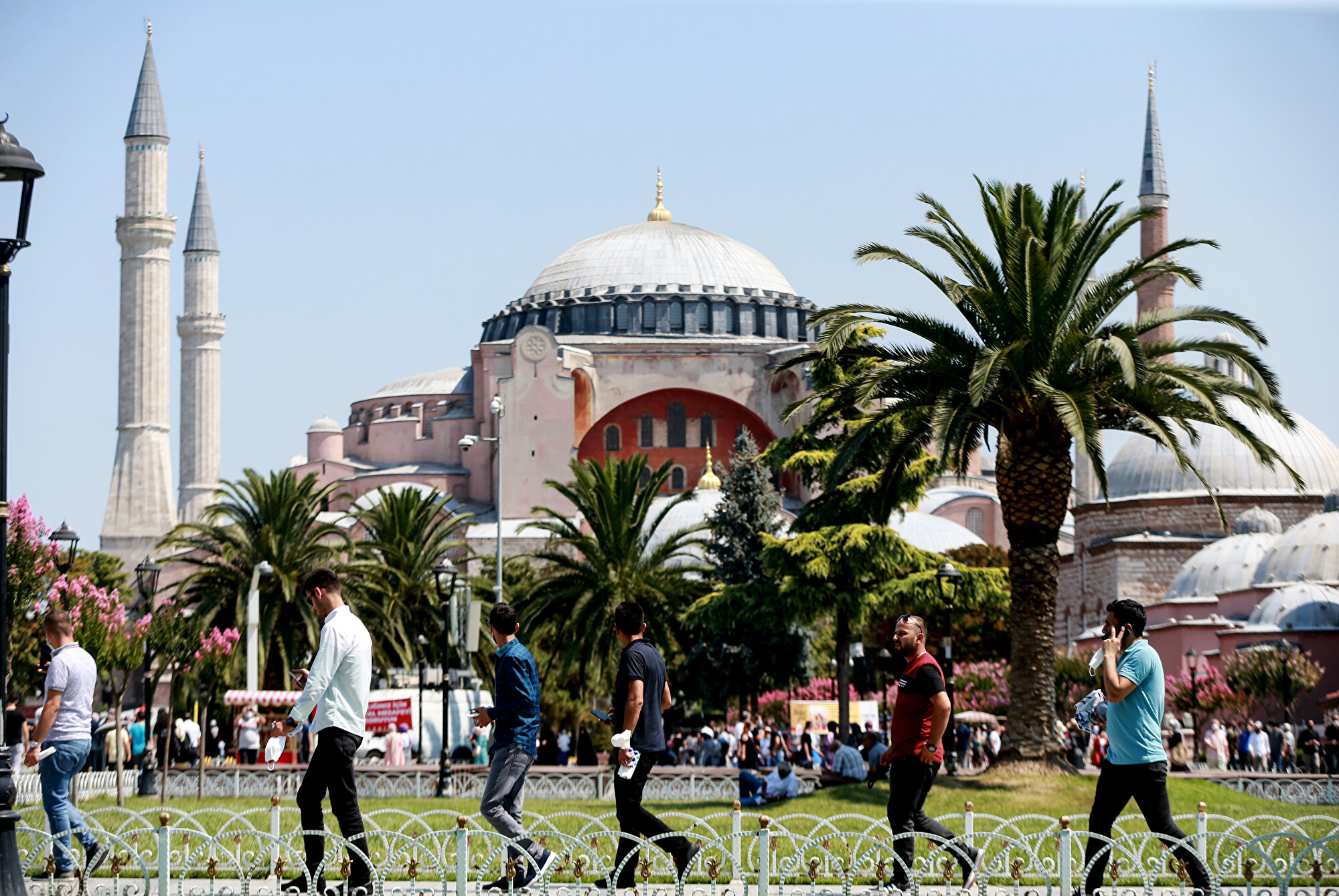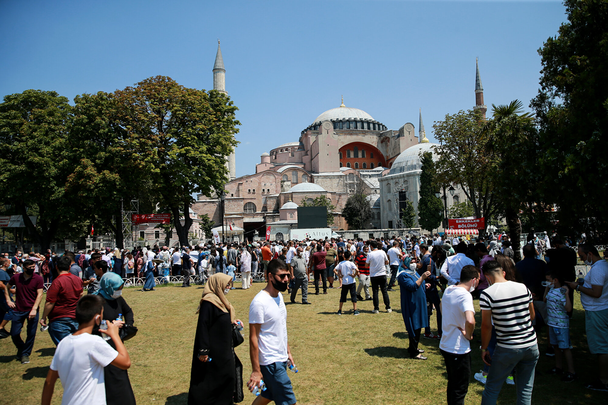 Ayasofya-i Kebir Camii'ndeki yoğunluğun bir benzeri de cami çevresinde yaşanıyor. İbadete açılan tarihi yapıyı görmek için gelenlerin bekleyişi nedeniyle Ayasofya bahçesinde ve Sultanahmet'te yoğunluk oluşuyor.