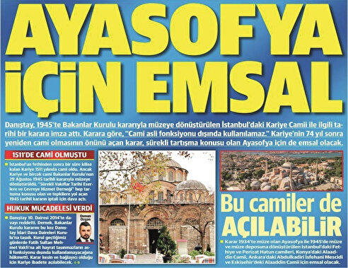- Danıştay, Ayasofya gibi yine bir Fatih Sultan Mehmet Vakfı eseri olan Kariye Camii’nin müzeye dönüştürülmesine yol açan Bakanlar Kurulu kararını iptal etmişti. Yeni Şafak, söz konusu kararı, 5 Kasım 2019’da ‘Ayasofya için emsal’ manşetiyle duyurmuştu. Haberde, Kariye’nin yeniden cami olmasının önünü açan kararın, sürekli tartışma konusu olan Ayasofya için de emsal olacağı vurgulanıyordu. 29 Ağustos 1945 tarihli Bakanlar Kurulu kararıyla müze yapılan Kariye ile ilgili Danıştay’ın tarihi kararında, Kariye Camii’nin Osmanlı döneminde özel hukuk hükümlerine göre vakfedildiği ve mazbut Fatih Sultan Mehmet Vakfı’na ait hayrat taşınmazlardan olduğu belirtilirken, hayrat taşınmazların ise vakfın belirlediği kullanım şekli dışında bir kullanım amacına tahsis edilemeyeceğine dikkat çekildi. Kariye’nin cami olarak kullanılmasında kanuna ve kamu düzenine aykırılıktan söz edilemeyeceği ifade edilen kararda, dava konusu Bakanlar Kurulu kararının yetki, şekil, sebep, maksat yönlerinden hukuka aykırı olduğu vurgulandı.