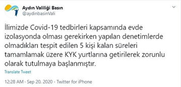 - Konu ile ilgili Aydın Valiliğinden yapılan açıklamada “İlimizde Kovid-19 tedbirleri kapsamında evde izolasyonda olması gerekirken yapılan denetimlerde olmadıkları tespit edilen 5 kişi kalan süreleri tamamlamak üzere KYK yurtlarına getirilerek zorunlu olarak tutulmaya başlanmıştır” ifadelerine yer verildi.