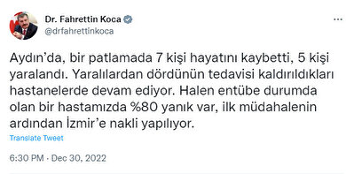 Sağlık Bakanı Fahrettin Koca, sosyal medya hesabından yaptığı paylaşımda, Aydın'da yaşanan patlamaya ilişkin gelişmeleri belirtti.