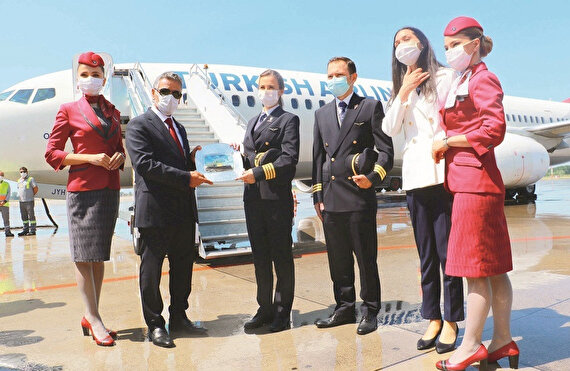 THY kaptan pilotu Selin Sevimli, ikinci pilot Zafer Doğukan Demir yönetiminde tarihi yolculuğunu tamamlayan uçağı, Samsun Valisi Osman Kaymak, AK Parti Genel Başkan Yardımcısı Çiğdem Karaaslan, AK Parti Samsun Milletvekili Orhan Kırcalı, Samsun Büyükşehir Belediye Başkanı Mustafa