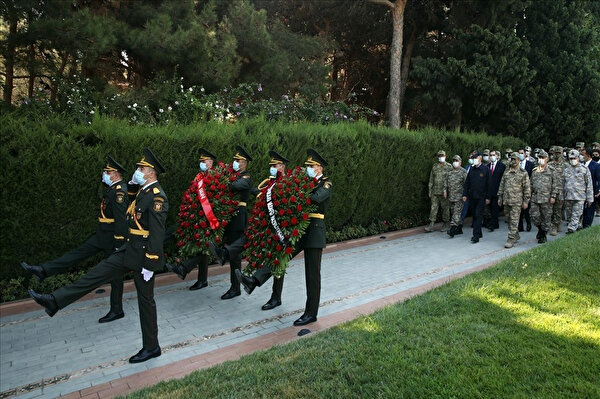 - Burada merhum Cumhurbaşkanı Haydar Aliyev’in kabrine çelenk bırakan Bakan Akar, merhum Aliyev'in eşi Zarife Aliyeva’nın mezarına çiçek koydu. Bakan Akar ve Komutanların sonraki durağı ise Şehitler Hıyaban'ı oldu.